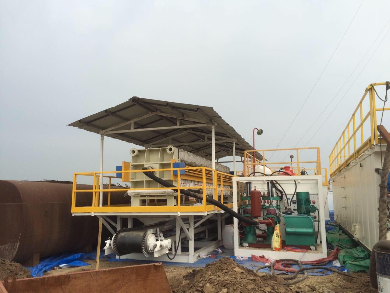 The complete drilling waste management system contain 5 tanks with agitators, Filter press, pumps etc. The mud tanks are storing the drilling fluid, using the plunger pump to cross to the filter press. After filter press, the water is very clear and the drilling waste is dryer.